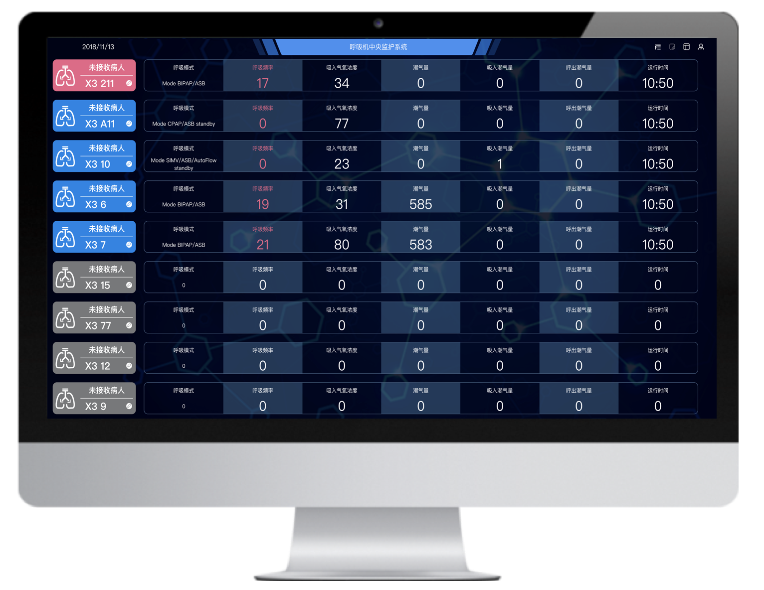 多臺(tái)不同品牌的有創(chuàng)呼吸機(jī)聯(lián)網(wǎng),并通過(guò)大屏實(shí)時(shí)集中呈現(xiàn)治療預(yù)設(shè)參數(shù)和監(jiān)測(cè)參數(shù),實(shí)現(xiàn)多臺(tái)集中監(jiān)測(cè)、集中管理和數(shù)據(jù)存儲(chǔ)。